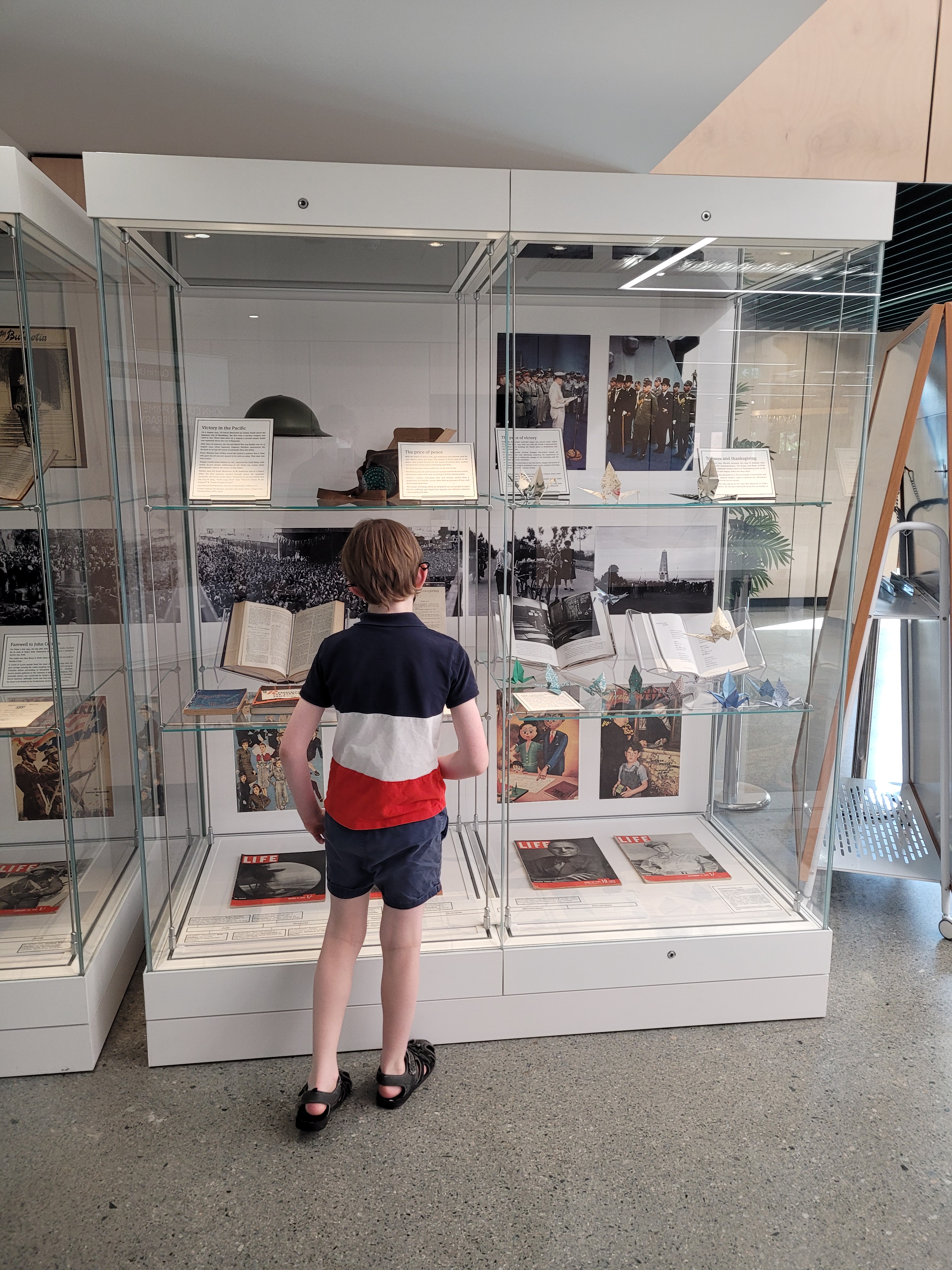 For many weeks, my son asked me each day what I was doing at work, and each day the answer was the same: the exhibition! His anticipation built and I was relieved when I could finally tell him it was installed. (How long can it possibly take to do one exhibition?) Last weekend, I took him and the rest of the family to Curtin University to see it. Curated by the special collections co-ordinator, Sally Laming, and I, ‘1945: The Price of Peace’ commemorates the death of John Curtin and the end of the Second World War. The title is taken from the words of John Curtin in parliament a few months before his death: ‘There is a price the world must pay for peace … I shall not attempt to specify the price, but it does mean less nationalism, less selfishness, less race ambition.’